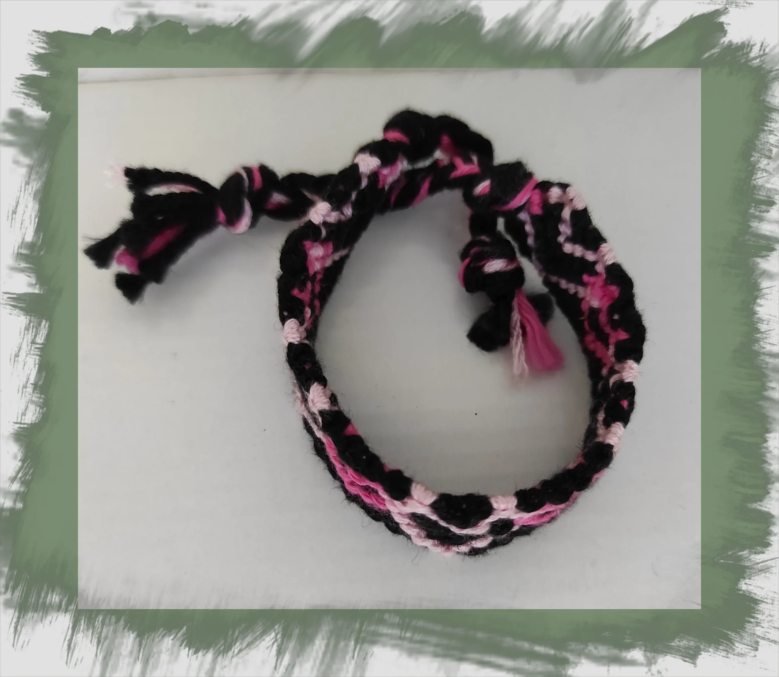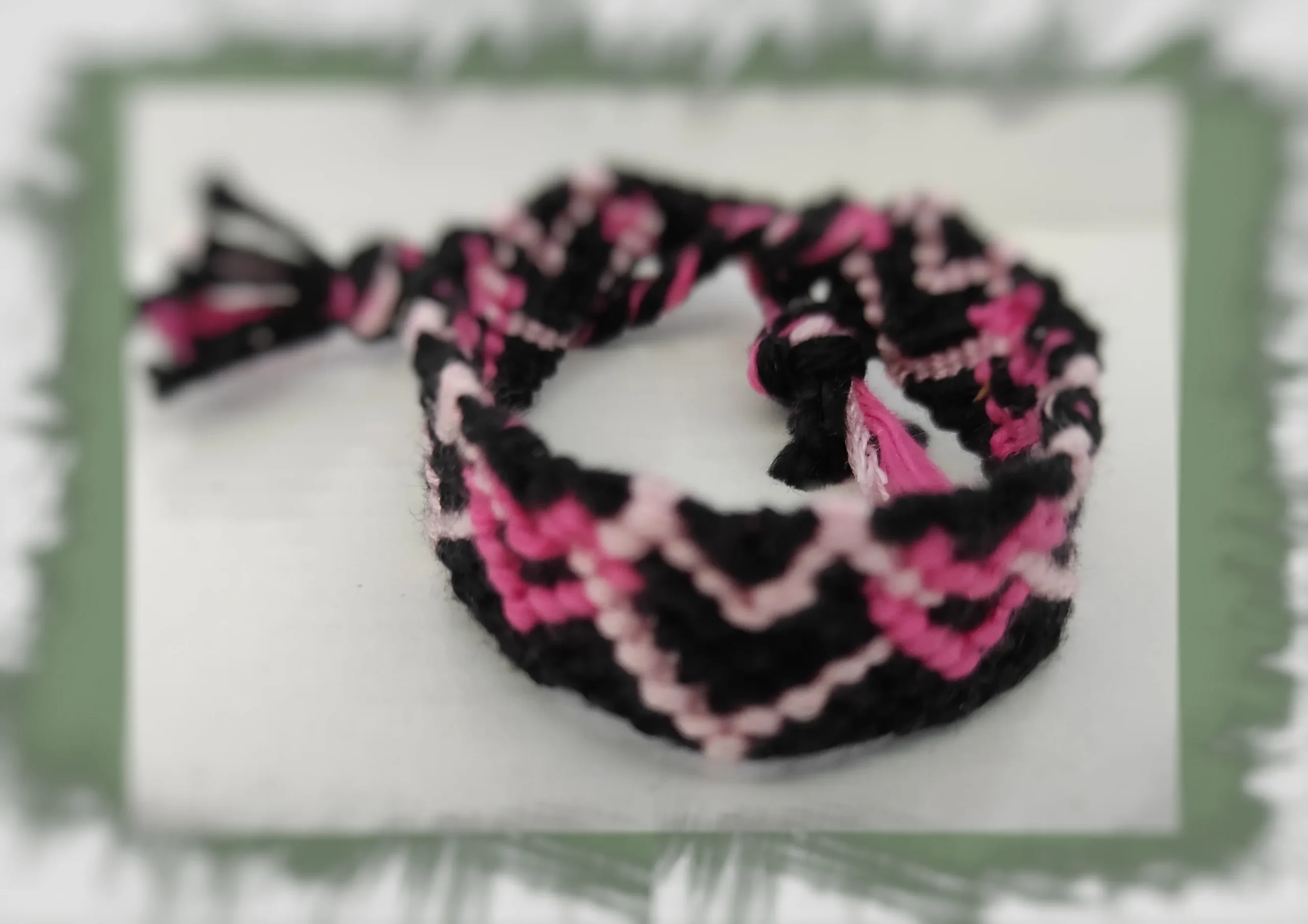 Bracelet brésilien noir et rose motif cœur réalisé en fil de coton.