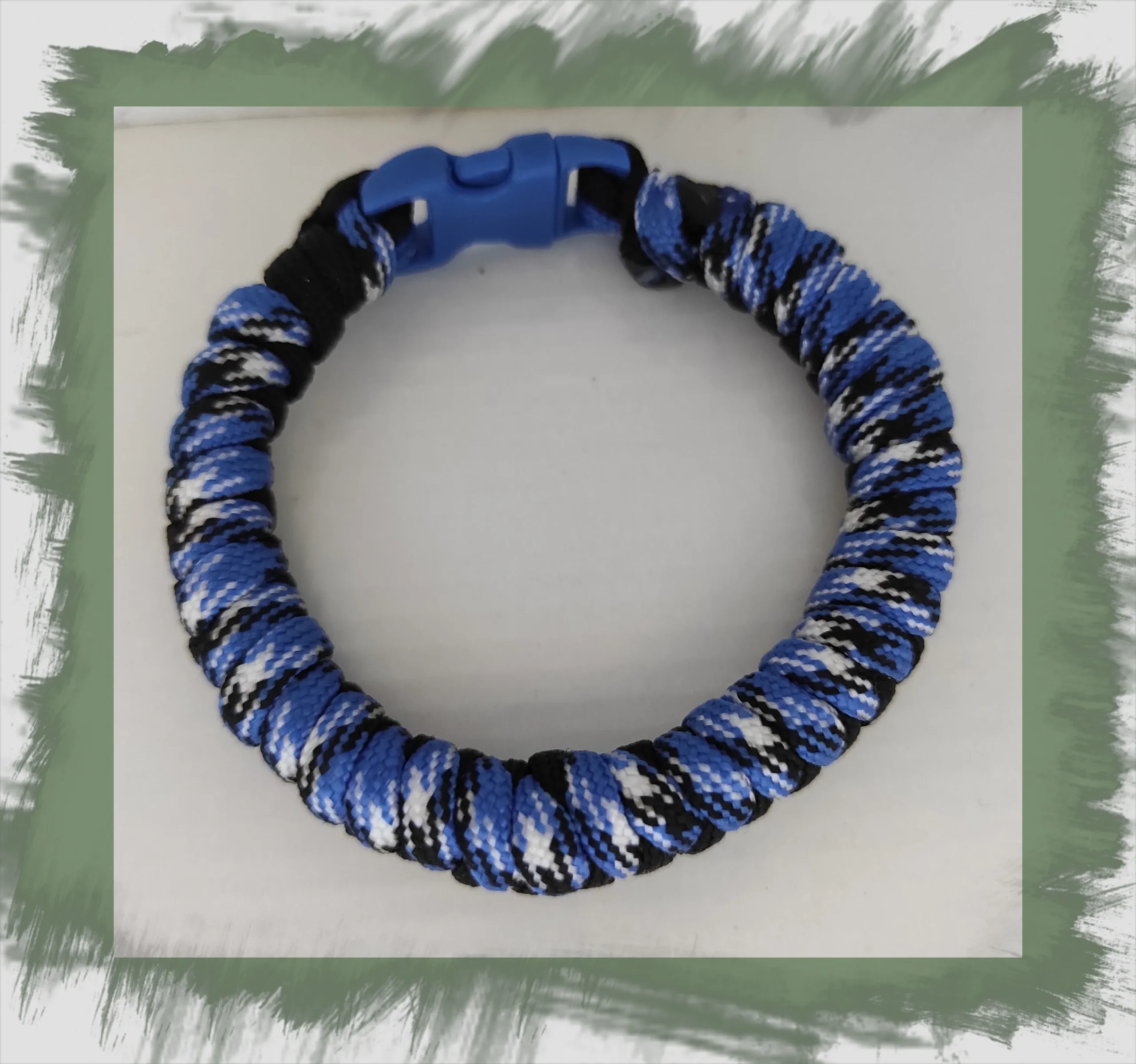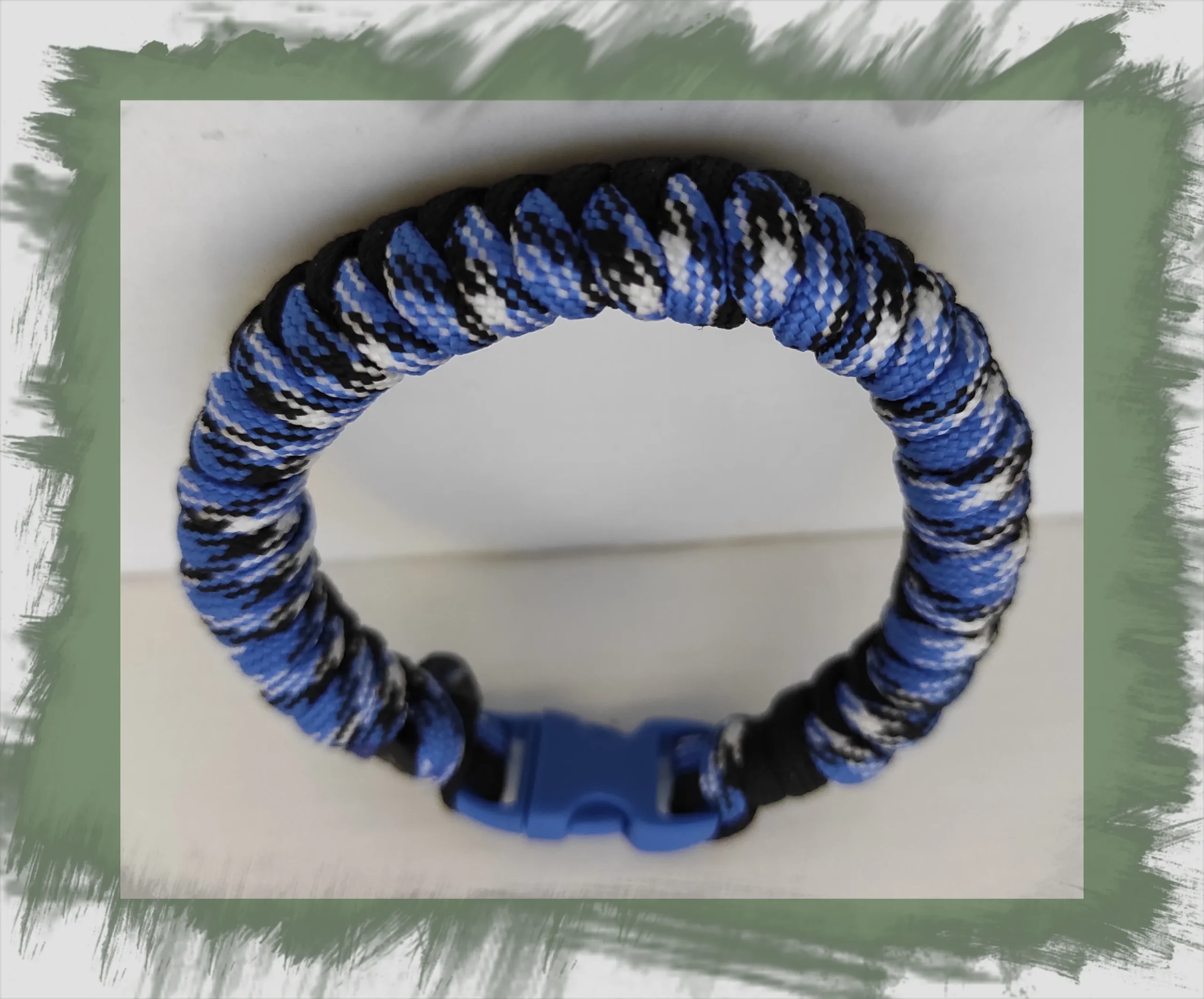 Bracelet macramé bleu, blanc, noir réalisé avec des fils synthétiques avec 1 fermoir en plastique.
