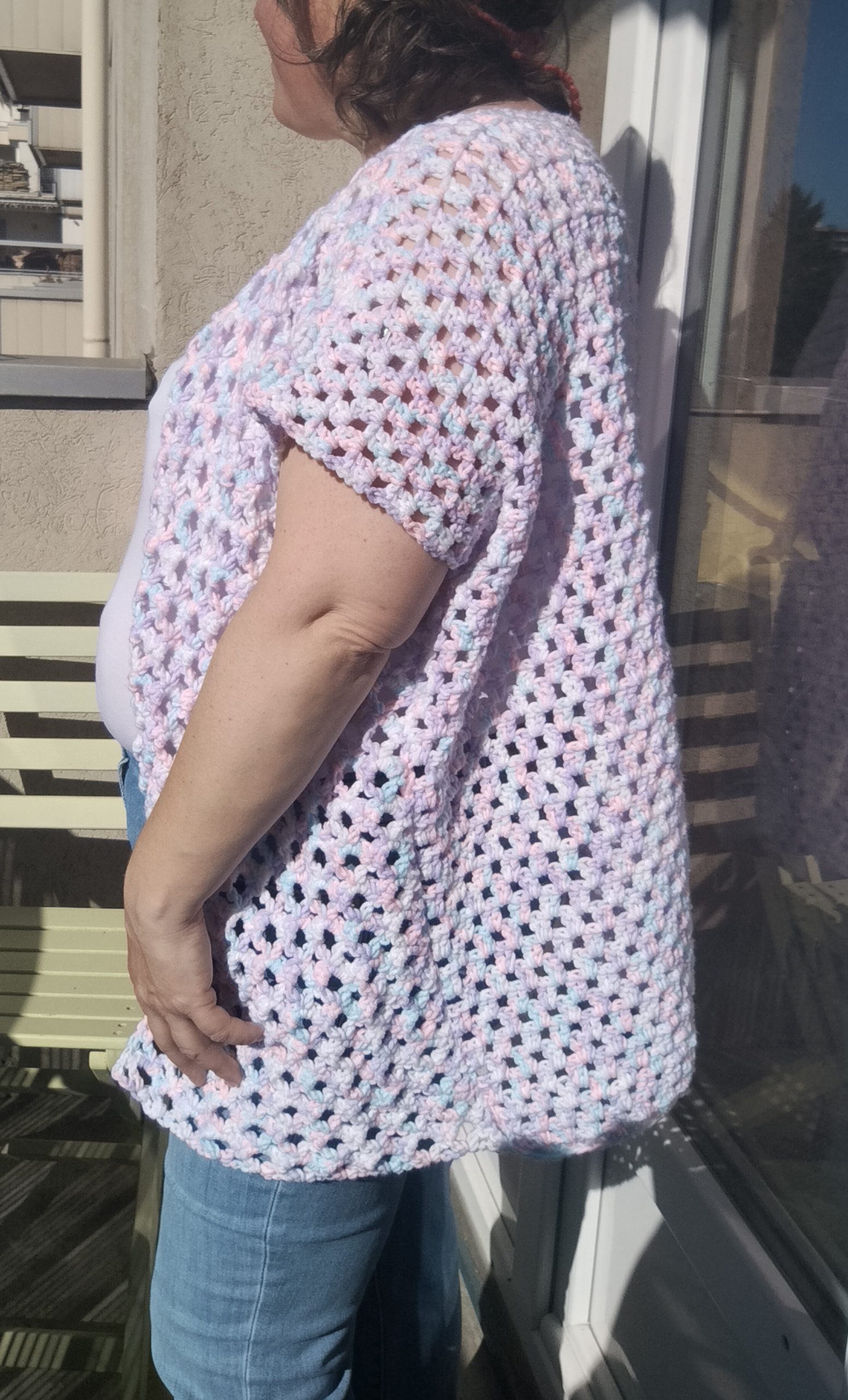 Gilet femme taille 42/44, crocheté à la main, en coton.